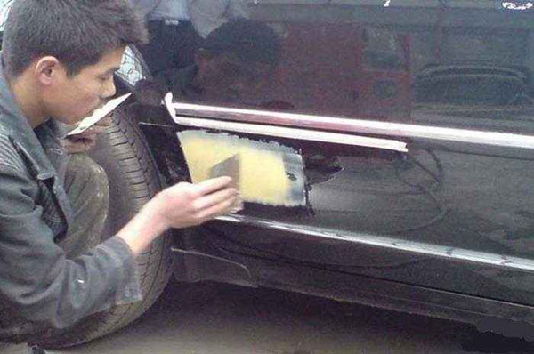 為了保證車身需要修補的位置的平整度,需要刮一層膩子,然後反複打磨,直到比較平整。