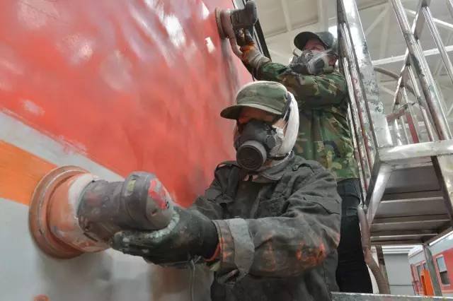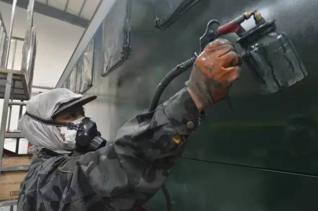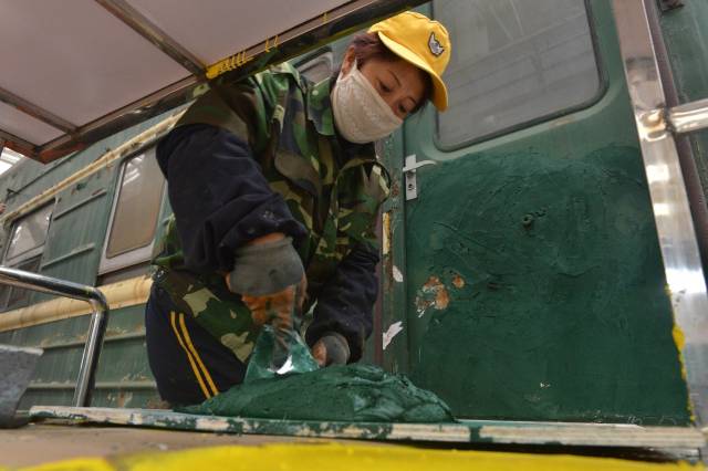 一輛客車從入庫到麵貌一新出庫,需經曆鏟車皮、刮膩子、打磨、噴漆、刷腰線、塗刷列車上各種標識等十幾道工序,大約要5天時間。包頭車輛段檢修車間草莓视频污版APP組每天負責4至5輛車的草莓视频污版APP噴塗工作,女工們分為幾個小組,每個小組承包一輛車。