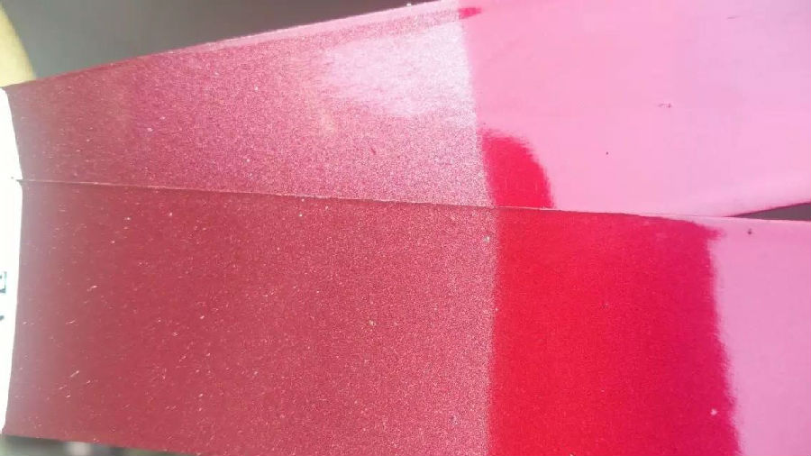 此類工藝不單單是指比如紅色配紅色色的效果,在很多時候是白色配紅色、橙色、黃色也是常見的,需要大家仔細觀察活學活用。 二、透明麵漆工藝 工藝利弊: 1、增強顏色鮮豔度及飽滿度是目前效 果最好的工藝 2、由於相近底色的襯托使顏色更容易達到 想要的色彩,省色漆塗料使銀粉擁有珍 珠的豐滿 3、 噴塗時應使用霧化比較好的噴槍才可 做到均勻覆蓋 4、再次修補需再次噴塗底色銀粉,因為 麵漆沒有遮蓋力 5、加大修補調色難度,噴塗厚度不易掌 握,紅色麵噴塗過厚正麵 深紅側麵淺紅 工藝常用顏色:魂動紅----馬自達係列 炫舞紅----福特係列 552P-----歌詩圖係列 施工工藝流程 : 魂動紅----馬自達係列 已噴塗中塗底漆施工件 底色紅銀 調配比例: 底色紅銀 : 稀釋劑 1 : 1 - 1.2 噴塗遍數 : 2 - 3 遍 (需完全遮蓋填眼灰) 閃幹時間 : 5-10分鍾 透明麵漆 調配比例: 透明紅麵漆 : 稀釋劑 1 : 1.3 -1.5 噴塗遍數: 1-2 遍 (因不同車紅度有差異) 閃幹時間: 15-20分鍾 清漆 注意!未噴塗過此類顏色的施工人員噴塗前應先在顏色對照板上噴塗練習噴塗技巧,以免造成紅色透明色噴塗過厚,造成銀粉沒有閃爍感。